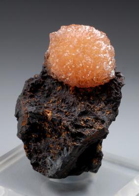 This piece features a ball shaped aggregate of salmon coloured olmiite crystals on a dark brown manganese ore. The crystal cluster is 2.3 cm wide and absolutely free of damage. Ex John Schneider collection.