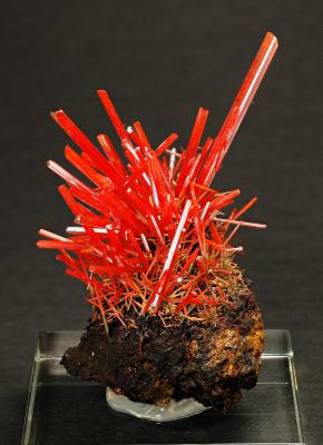 A wonderful spray of perfect crocoite crystals perched on a nicely contrasting matrix! One of the very best pieces from the recent finds.