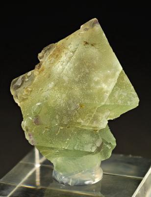 This is a very rare sample of green alpine fluorite featuring several modified crystal faces. The predominant octahedral faces are accented by a slightly purple second generation layer that features rhombohedral and cubic faces. This crystal aggregate is a floater and in perfect condition all around. Very unique style, from a small and limited find.