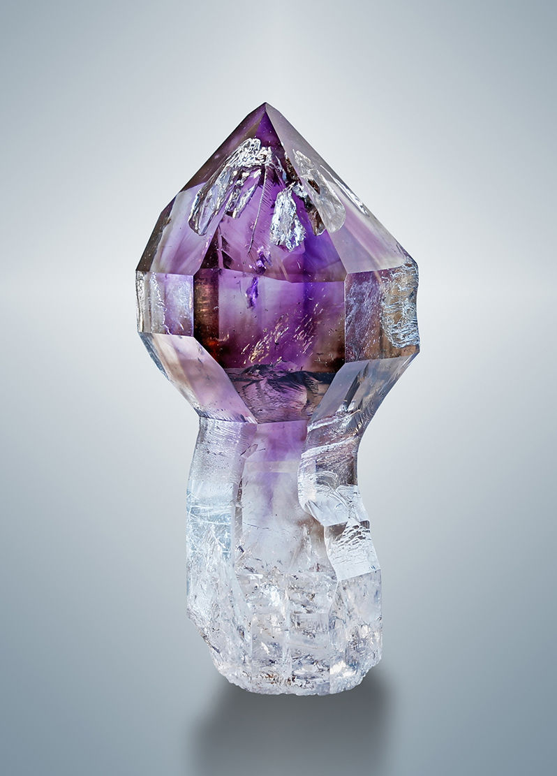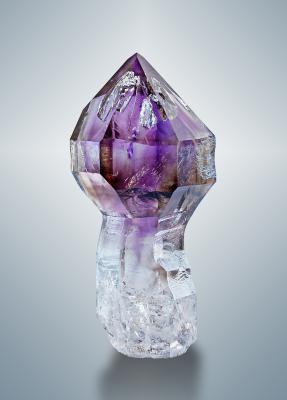 What a sharp and pristine texbook sceptre crystal! Deep amethyst and smoky colours, fine fensters, great clarity and luster, the crystal is fantastic in every respect! No damage.