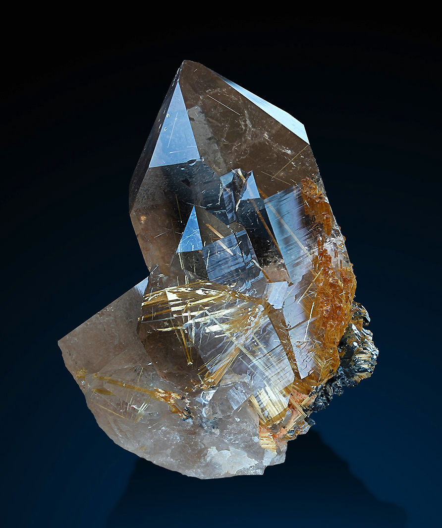 Golden rutile inclusions in clear quartz. Hematite crystals are attached on the lower right side. Great condition and shape.