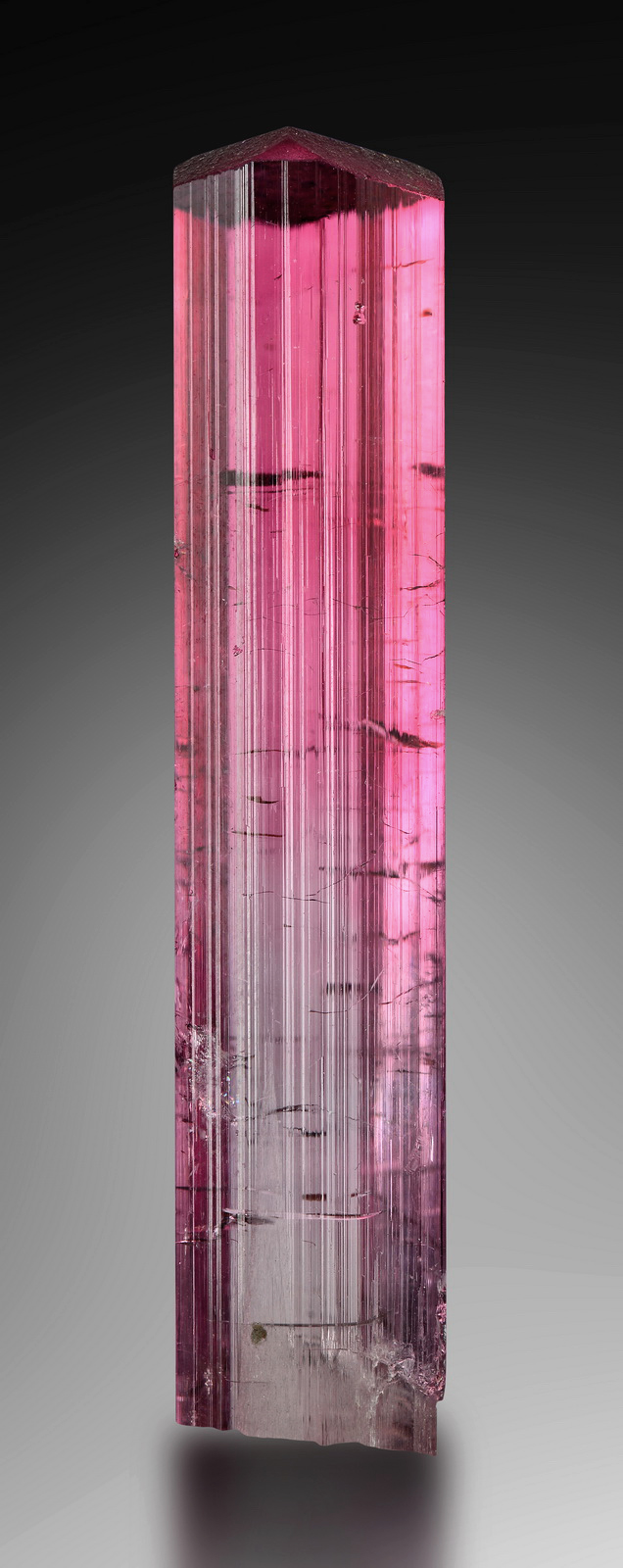 White is probably the rarest colour of tourmalines. This fantastic crystal has a totally clear and colourless core in the bottom section. The pink colour increases upwards and reaches a pleasing pink in the top section. The termination faces are sharp and free of any chips.