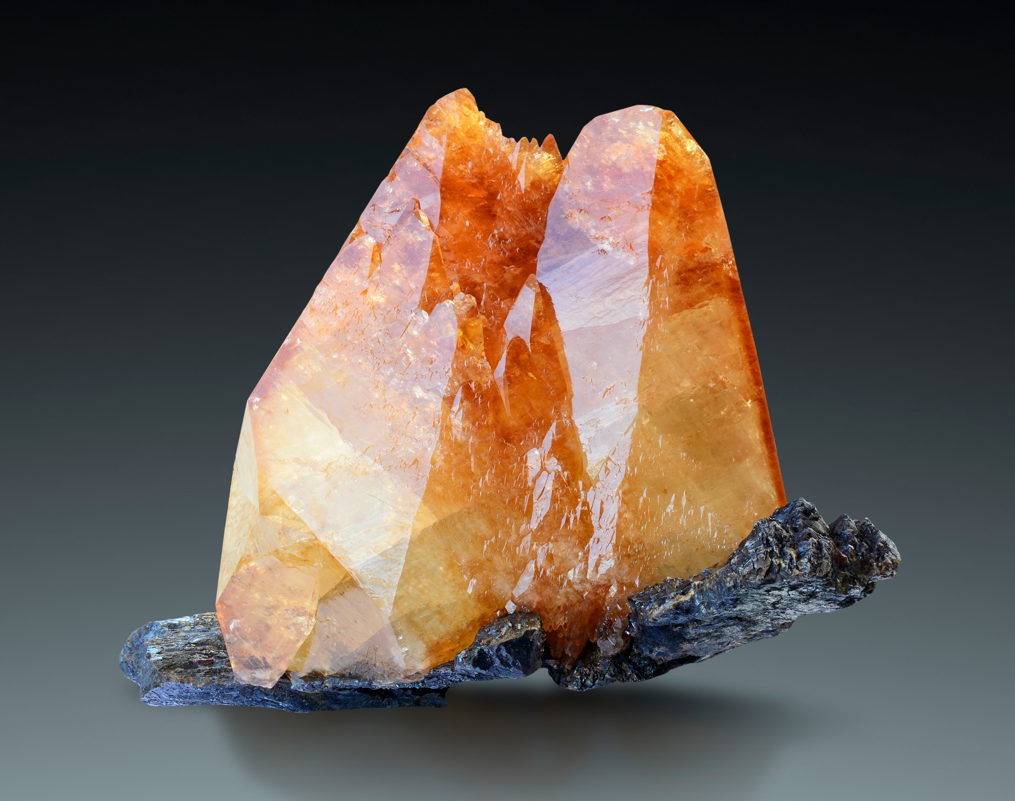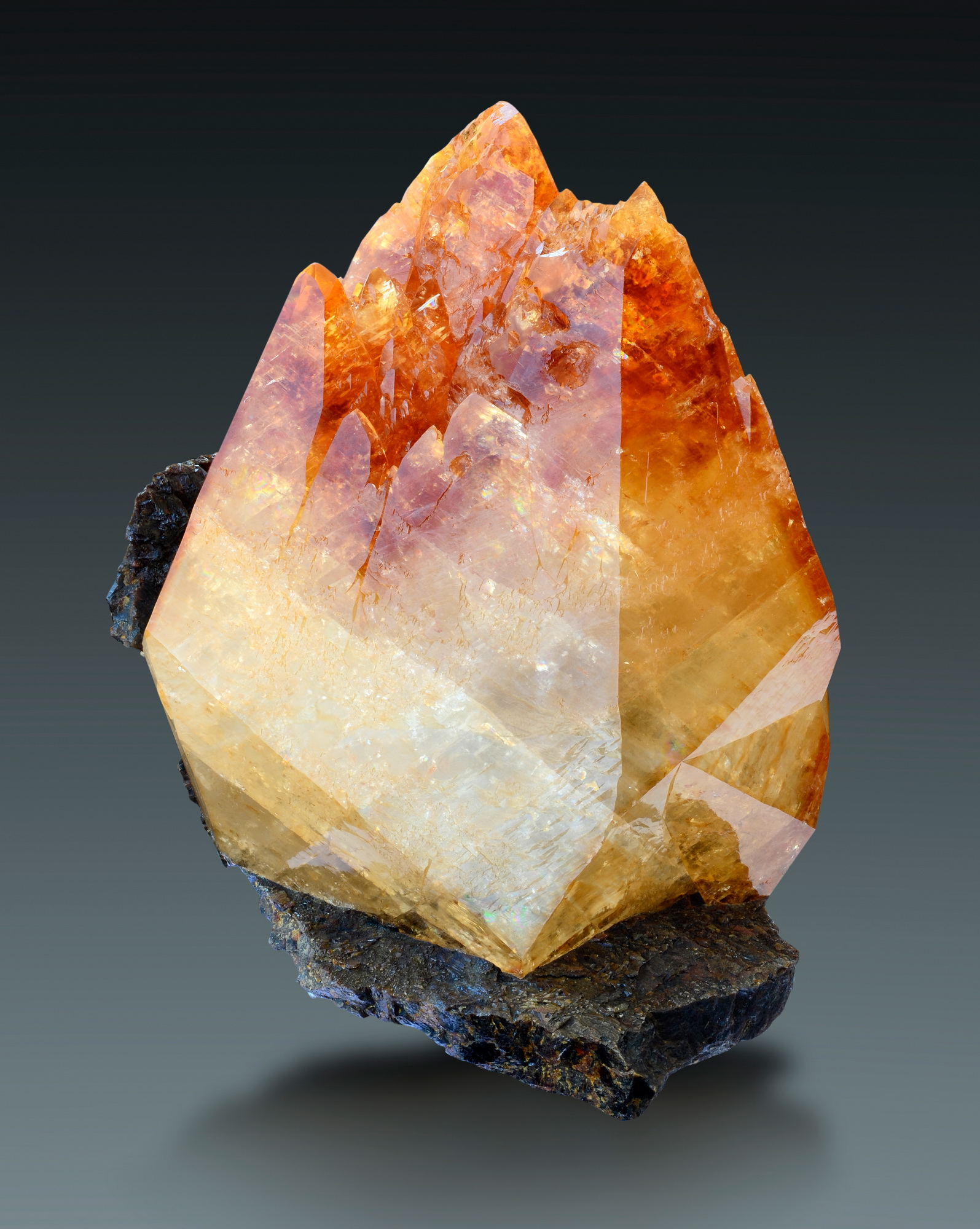 A deep amber coloured calcite crystal sitting on a floater shard made of sphalerite crystals. The colour is as good as it gets at Elmwood mine, and the crystal formation is great as well. The dark sphalerite sets a pleasing contrast. No significant damage to report.