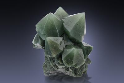 Superb green crystals of beta-quartz shape, showing just an upper and lower pyramid but no prism faces. Very 3-dimensional and showy all the way around.