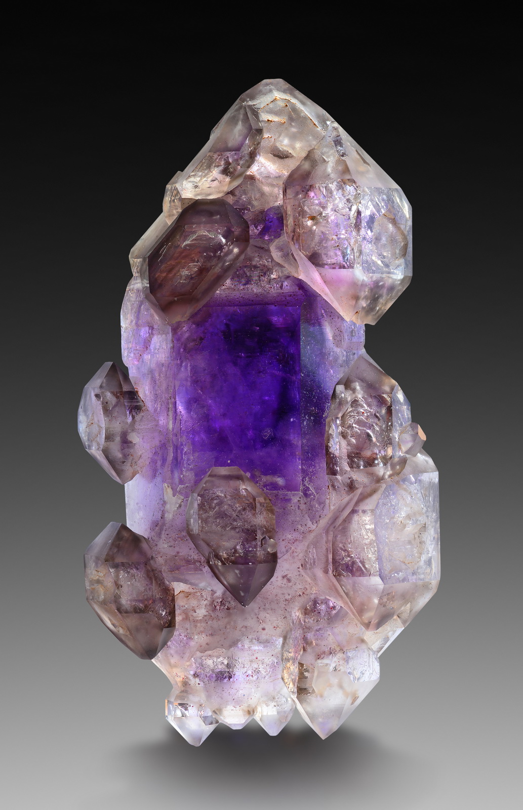 Superb doubly-terminated sceptre amethyst with sidecars. The first generation is an amethyst of deep purple colour, the second generation shows a lovely smoky hue. No siginficant damage.