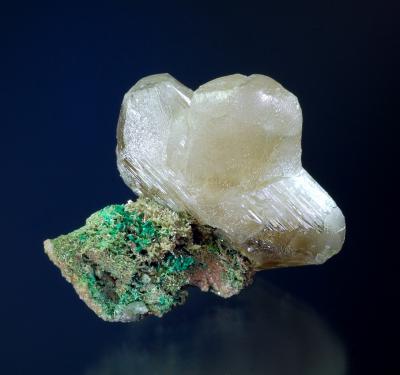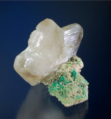 This specimen features a twinned, thick and massy cerussite crystal perched on a shard of calcite matrix which is covered by small mimetite, malachite and probably also duftite crystals. The piece is actually a floater and in perfect condition all around. Also, the piece has great visual impact and it is truly a great small cabinet sized sample of the species. Ex Steve Smale collection.