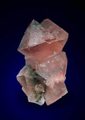 A 4 cm pink fluorite octohedron perched on smaller fluorite crystals! Small chlorite inclusions in places add a nice contrast. The crystal grew on a quartz crystal and became detached during growth, a small shard of that quartz crystal is still attached to the back side. The entire back side is re-crystallized and free of any damage or new contacts. Great aestetics and impact!