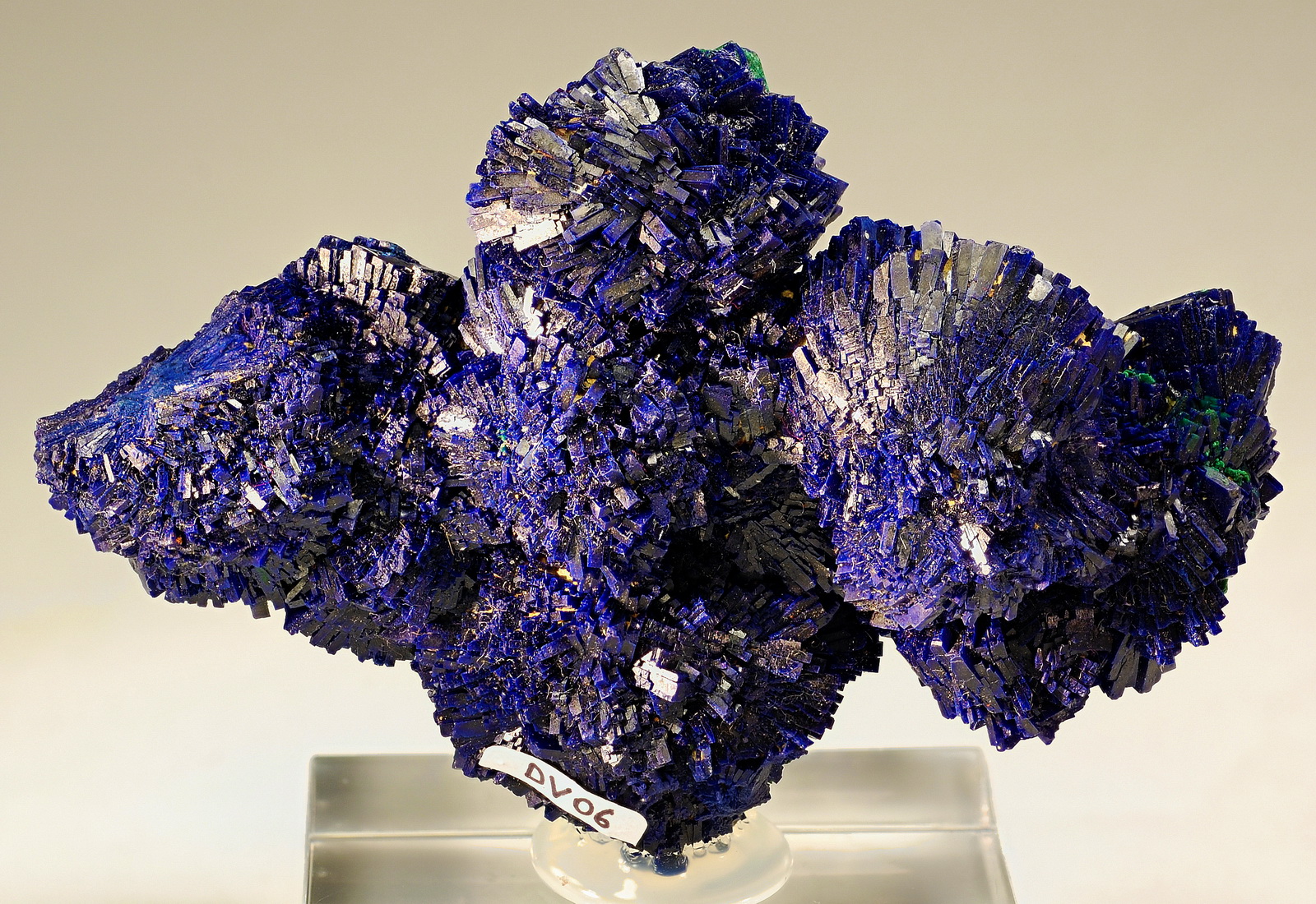 Great azurite rosettes to 36 mm diameter forming a very aesthetic and well-balanced cluster aggregate. Minor Malachite attached on the lower front side provides a very nice colour contrast. One of the very best azurites i have ever seen from China! Great condition and visual impact!