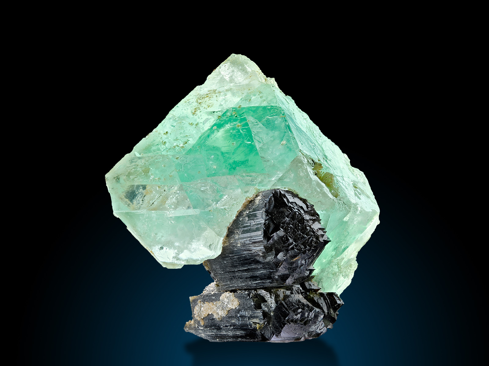 A glossy greenish octahedron perched on two parallel inter-grown balck tourmaline crystals with green zonings at the end points. The tourumaline crystals are sharp terminated and lustrous. Nice contarst and very aesthetic assemble.
