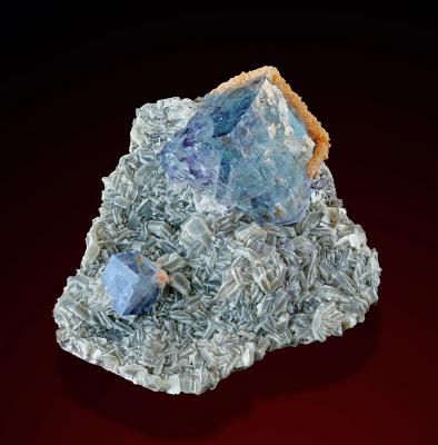 The sharply terminated fluorite crystal is 22 mm on edges, its faces are highly lustrous and show intense sky-blue color with minor violet zoning. Two edges are framed by brown-red siderite crystals. The Fluorite is embedded in light grey well shaped Muscovite crystals. A very aestheic specimen and in great condition damage-wise.