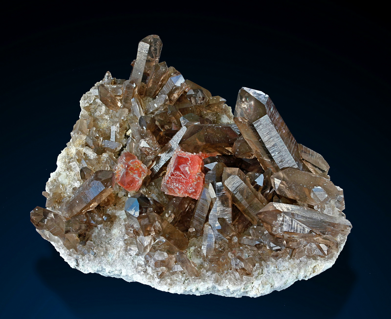 Striking cabinet sized specimen featuring 2 rosafluorites placed right in the center of clear smoky quartzes. The piece comes from the famous Rufibach pocket found in 1962. Great condition and visual impact!