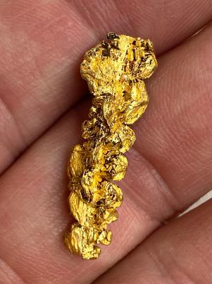 Large and sharp gold crystals, stacked to a beautiful elongated cluster. Minor calcite is present at a few places.