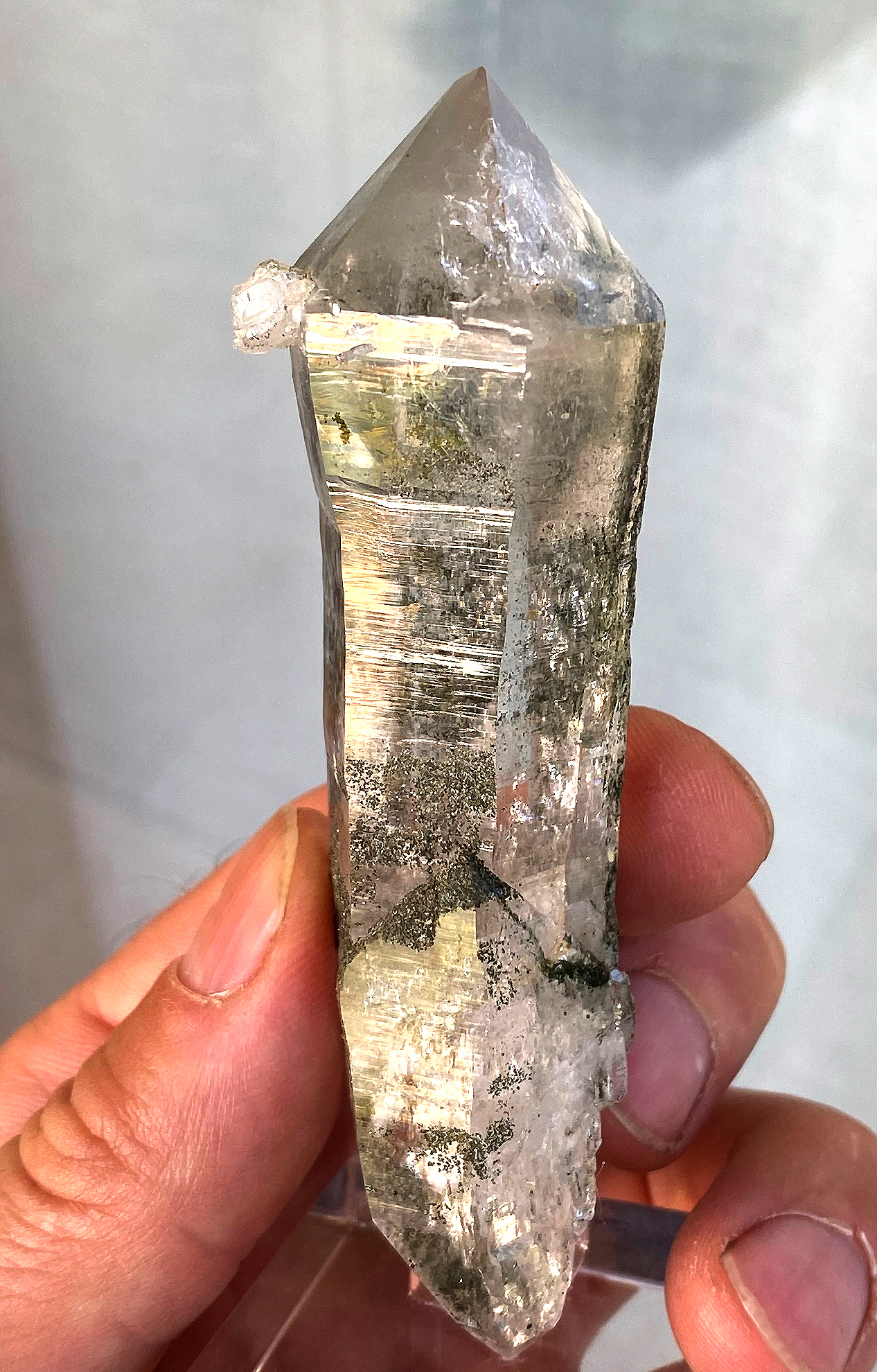 Crazy unusual quartz scepter. The angles of the scepter head are indeed unique, like a reverse tessin quartz, I have never seen anything like it before. A few chlorite inclusions add a pleasing typical alpine look. No damage.