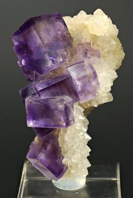 A group of purple fluorite cubes perched on white quartz crystals. Very aesthetic and in perfect condition.