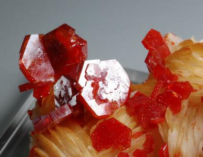 Deep red vanadinites on nicely contrasting baryte crystals.