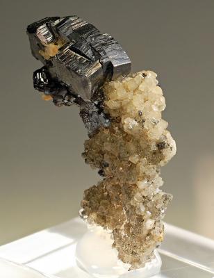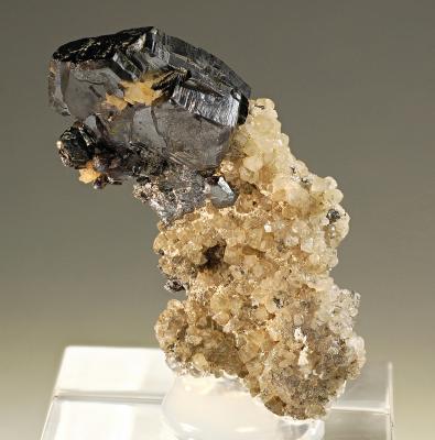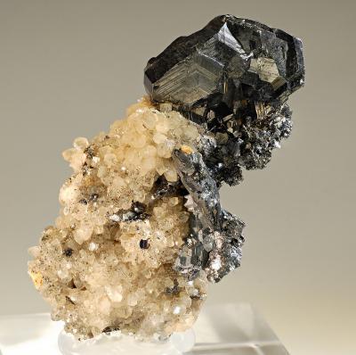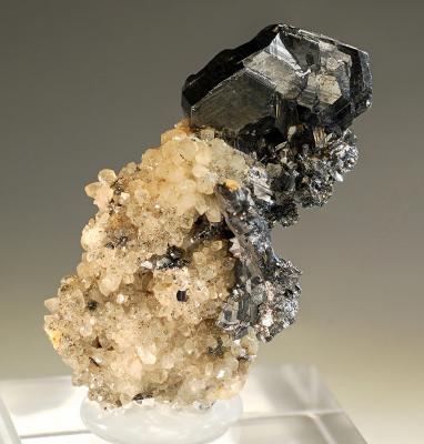 Sharp, well-formed and isolated stephanite crystal perched on white calcite crystals! The stephanite measures 21 mm across and is accompanied by small pyrargyrite crystals. This specimen comes with an old historic box, an old label stating "Melanglanz" and the newspaper where it was wrapped. That piece of newspaper is dated march 25, 1913! The lustre is very fresh and brilliant which proves that the piece has been kept in the dark since it was found. What a gorgeous sample of this rare silver sulfosalt!