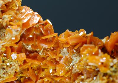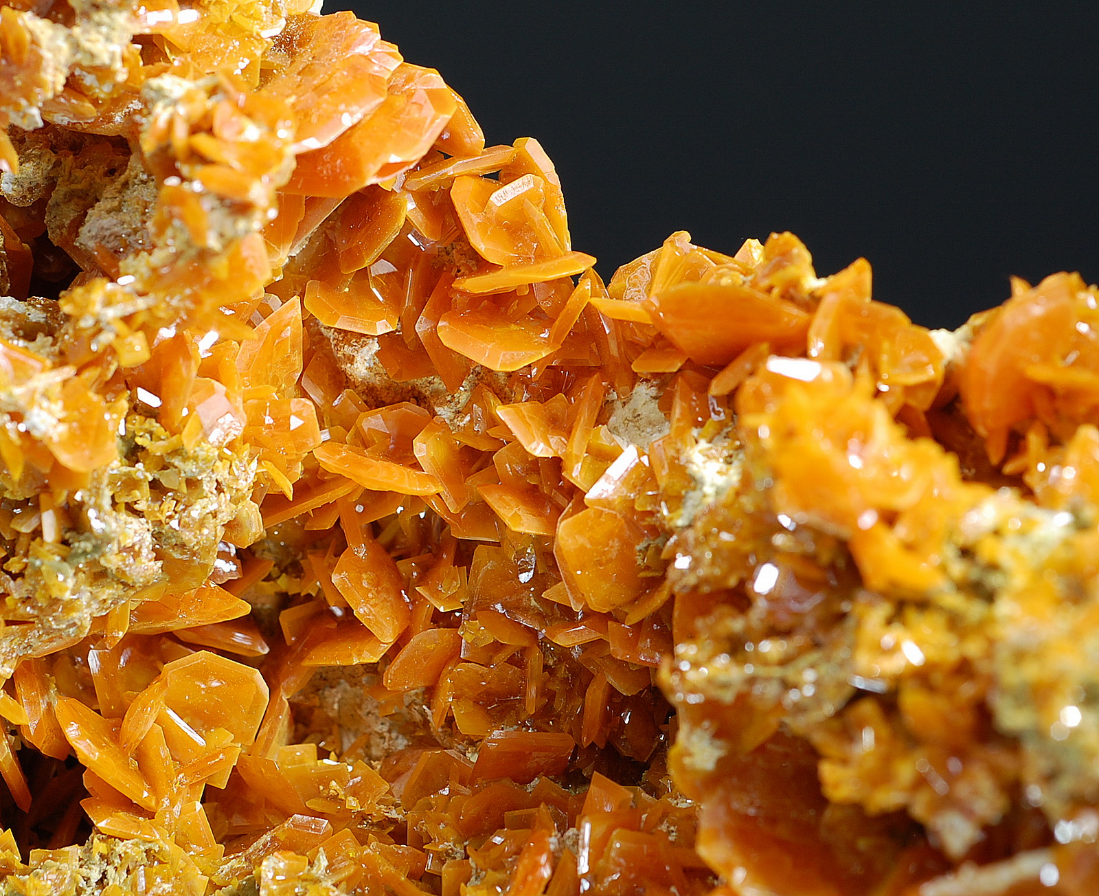This piece features an elongated matrix almost fully covered by lustrous, orange wulfenite crystals. The piece is very 3-dimensional, and almost all of the crystals are in perfect condition. Great display and visual impact!