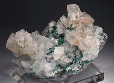 Wonderful specimen featureing sharp rhombs of calcite and sparkling dioptase crystals in between. A few of the calcites show reddish hematite inclusions also. Great display from either side!