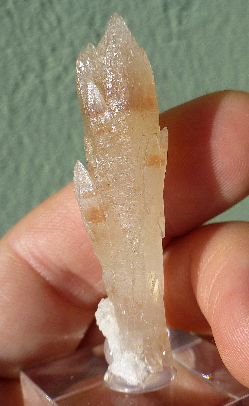 A very large and very sharp elongated bi-colour crystal of strontianite. A few side crystals and a small dolomite matrix make this an extremely fine sample of the species! As good as crystals of this habit can get! Found in the 1960s, no more crystals have ever reached this extraordinary quality!