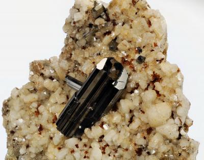 A perfect and highly lustrous, 19 mm long rutile crystal perched on a bed of small pericline and mica crystals! The rutile has incredible striations and great termination faces. What an excellent sample from one of the very best rutile finds ever made in the Alps!