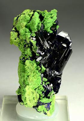 This is a superb, highly lustrous azurite perched on bright green matrix. Just wonderful! There is no damage on front side. The colour contrast is superb, and also the luster!