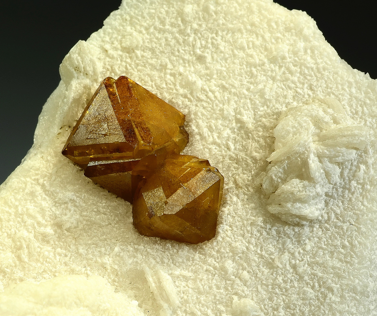 This specimen features two microlite crystals up to 1 cm on edge on white feldspar matrix. Great shape and contrast!