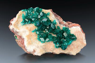 This specimen features a large group of gemmy, sharp dioptases in the center of matrix and set on white calcite layer. The specimen shows really a wonderful contrast! The intense green crystals are up to 13 mm across and all prominent crystals are intact. No significant damages to report.