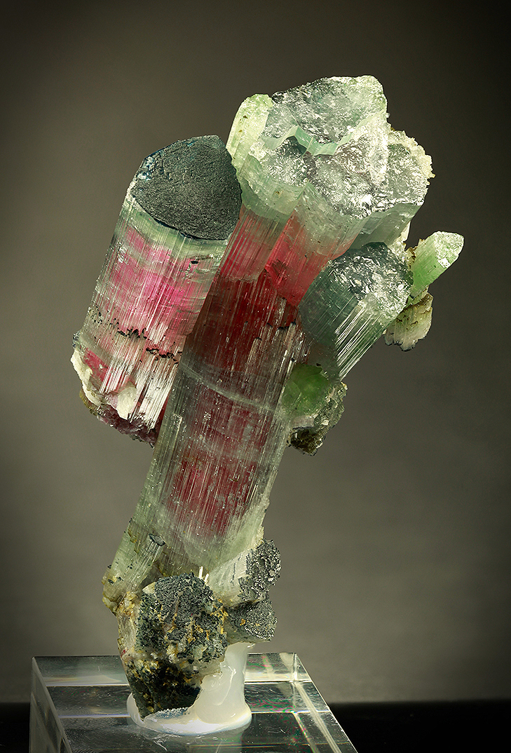 What a fine cluster of classic Brazilian watermelon tourmaline! The front crystal has a perfect termination and shows a very deep and vivid colour.