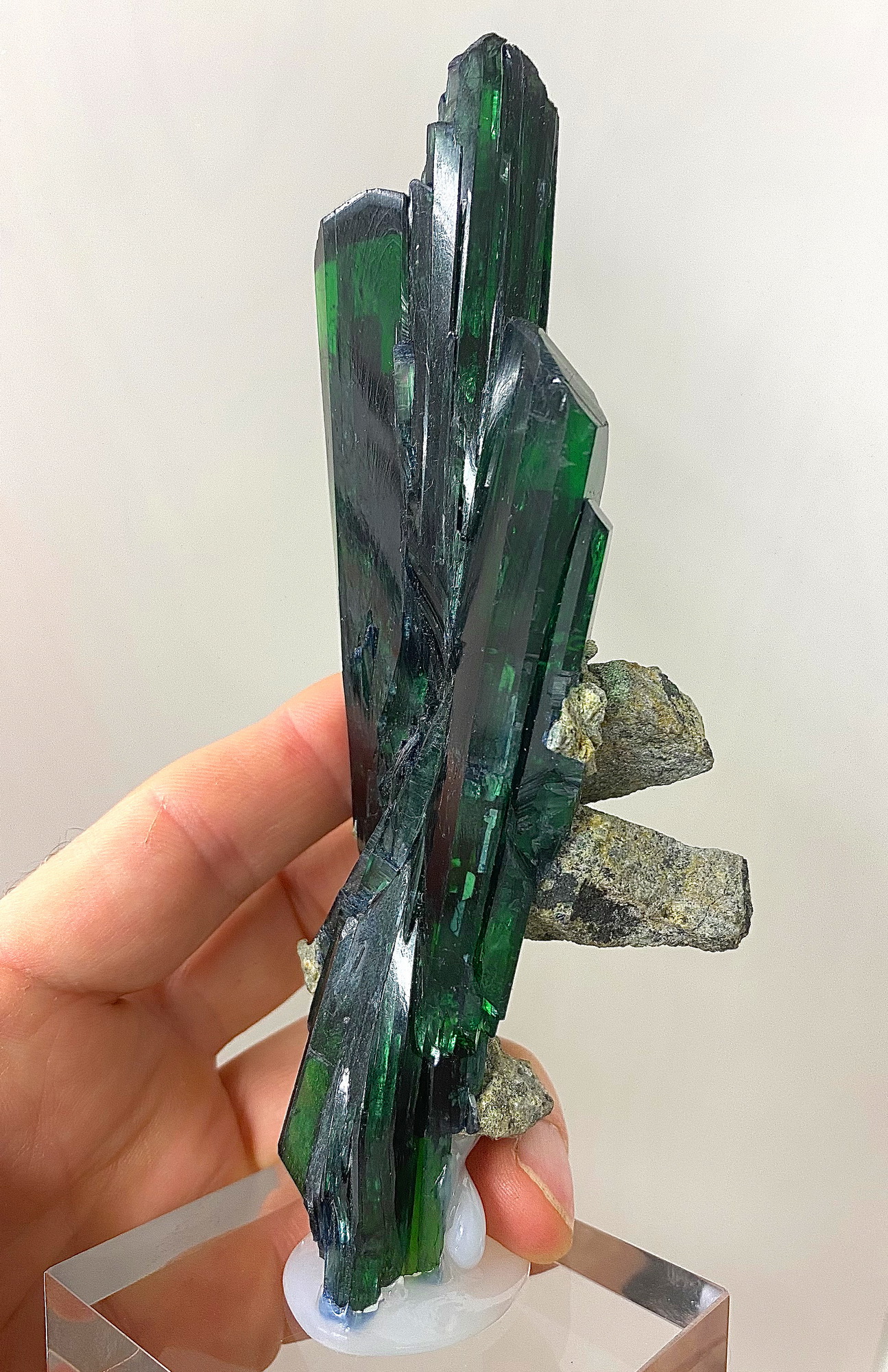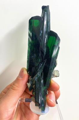 WOW! What a striking cabinet size vivianite cluster! This piece is a really big cluster of several clear vivianite crystals and some parts of breccia matrix attached on the right and back sides. The crystals are big, lustrous and gemmy, and several of them show even a crazy twist. From the best pocket of the mine, found in February 2019. All the later pockets did not reach this size and quality any more. A great floater piece, very showy all the way around!