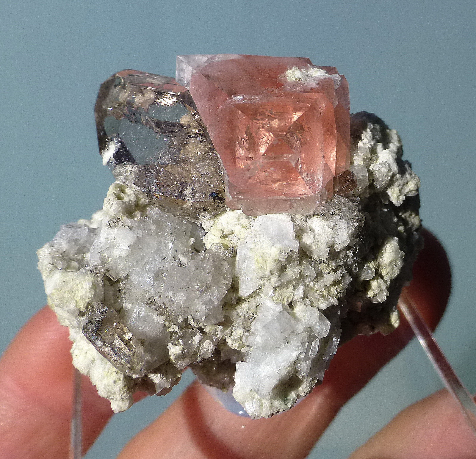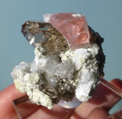 Wonderful combination of pink fluorite and smoky quartz on granite matrix. No damage.