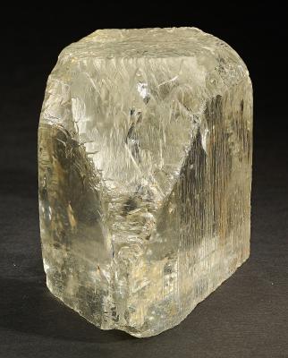This is a large and totally clear topaz from a classic Brazilian find. The base is cleaved, and there is one spot of damage on the rear side, otherwise the crystal is in great condition. Note the well-formed growth patterns on the side faces. 491 grams of transparent cutting material! Comes with an old label indicating the specimen was sold for 2100 Schilling in 1962 (That would equal about 150 Euros today).