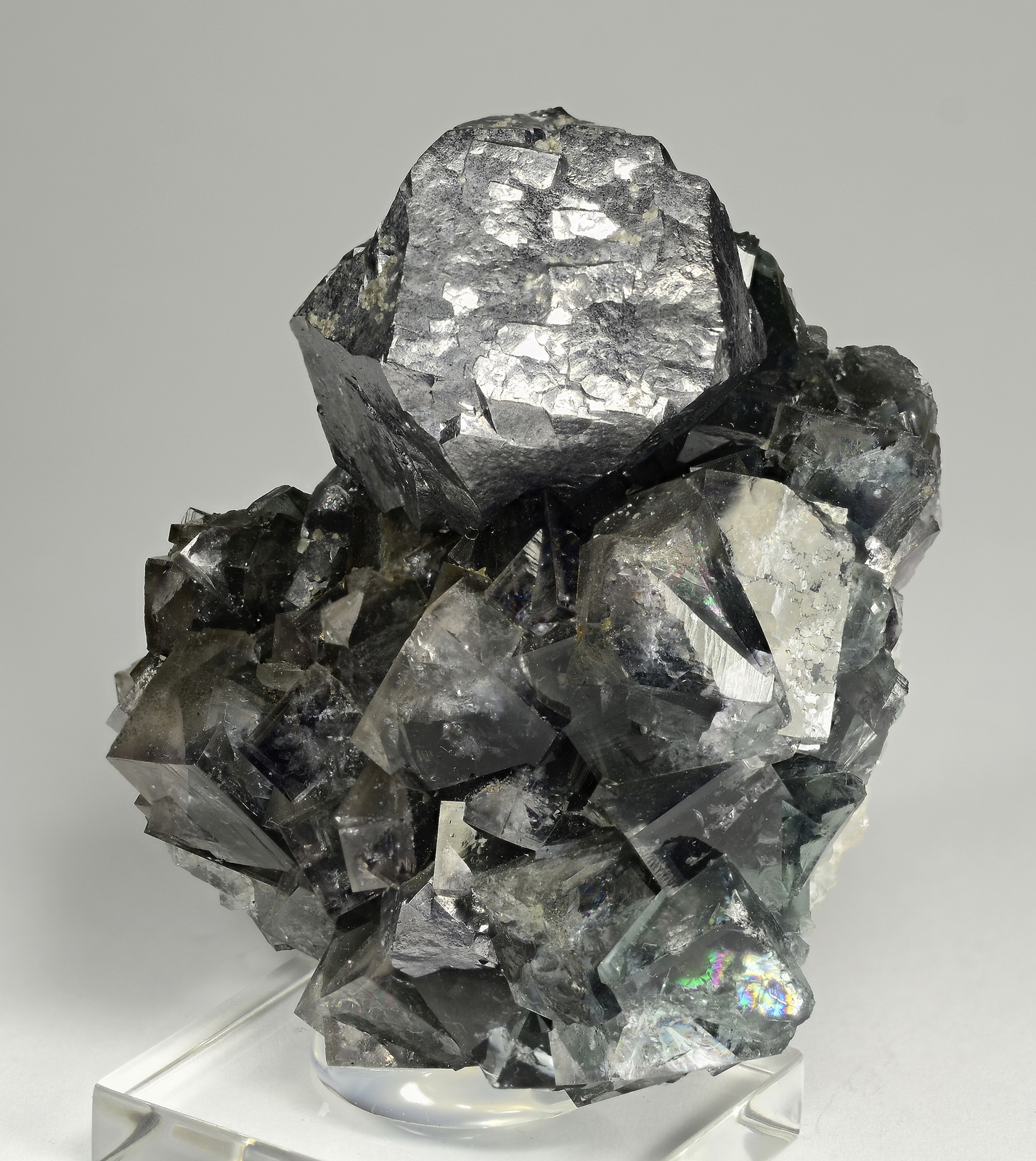 Beautiful galena crystal resting on a matrix of fluorite twins.