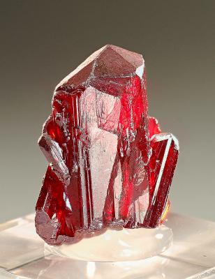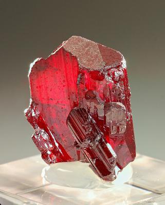Bright RED aggregate of proustite crystals. Gorgeous colour - it just glows without any light source in the back! There is one damage on the right side of the termination, however, most of the termination faces are still intact. This piece truly sets a standard for colour, clarity and luster, it is the very best i have ever seen on any proustite specimen.