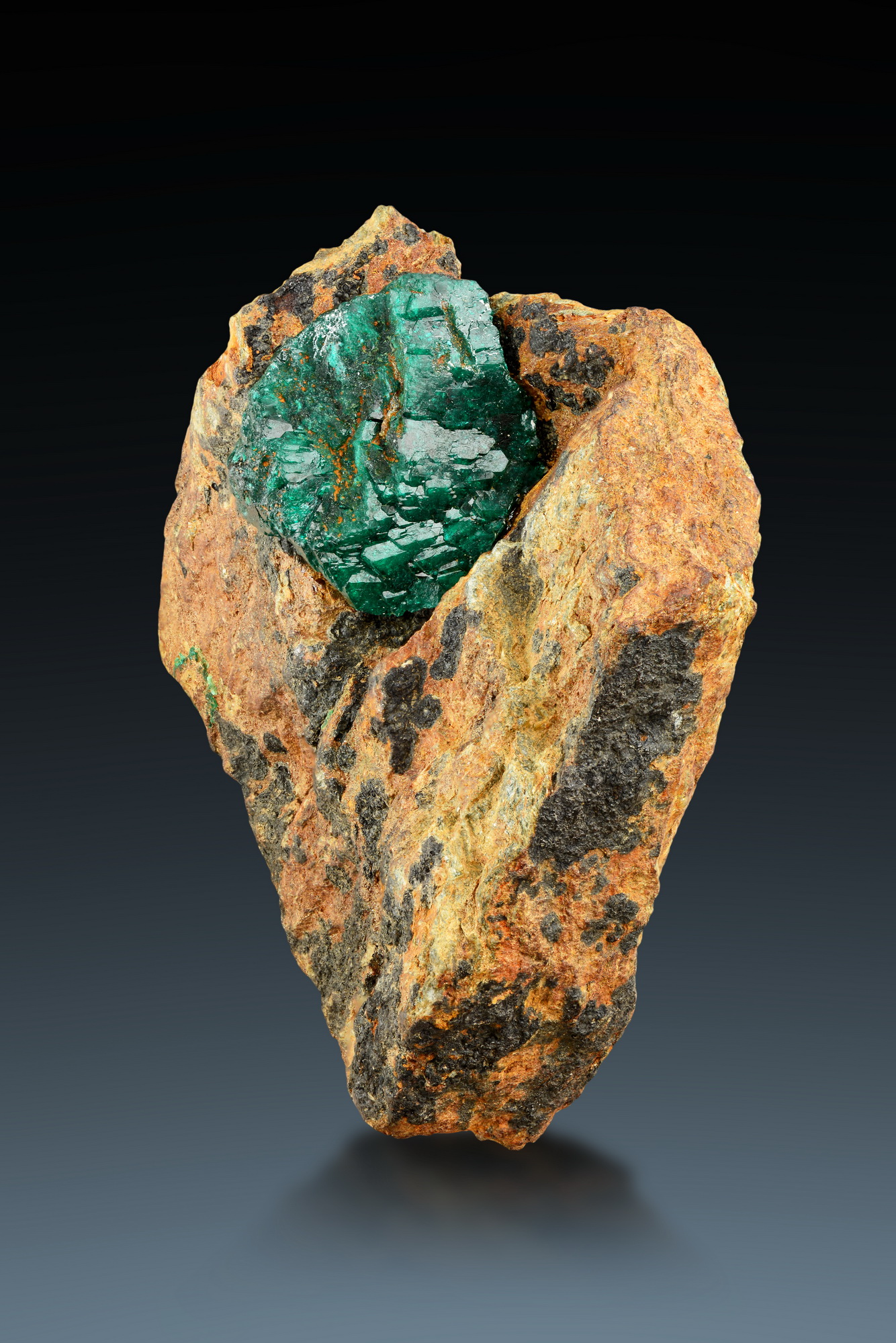 Intense orange-yellow fan-shaped mimetite crystals with sparkling faces on a well balanced matrix, a little green spot of malachite sets a lovely contrast. A really nice sample in excellent quality!