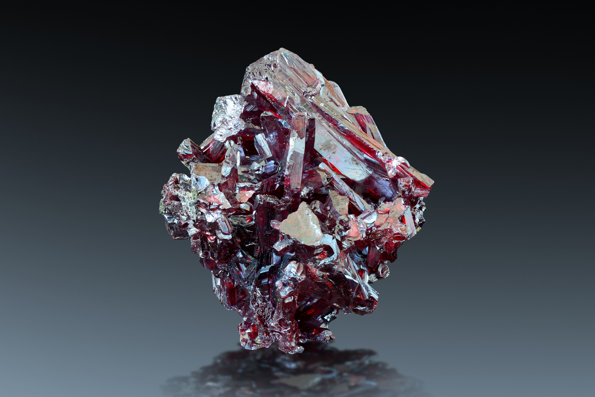 WOW! What a rich and well defined sample of classic German proustite. The mining district of Schlema, Saxony is well known in the mineral world for its sharp and fiercy red proustite crystals. This specimen is a complete solid mass of proustite crystals throughout, it certainly was collected in an exceptionally rich ore vein. Individual crystals reach a length up to 3.5 cm. The first picture shows the specimen glowing deeply red in backlight, but even the other pictures in regular led light show a significant red hue, which is even better in the hand. Ex H.-G. Penndorf collection, Dresden, coll.no.811. Two of his labels are still comimg with the piece, stating the piece was found in 1960 in Gang Brahma on 720 meters below sea level.