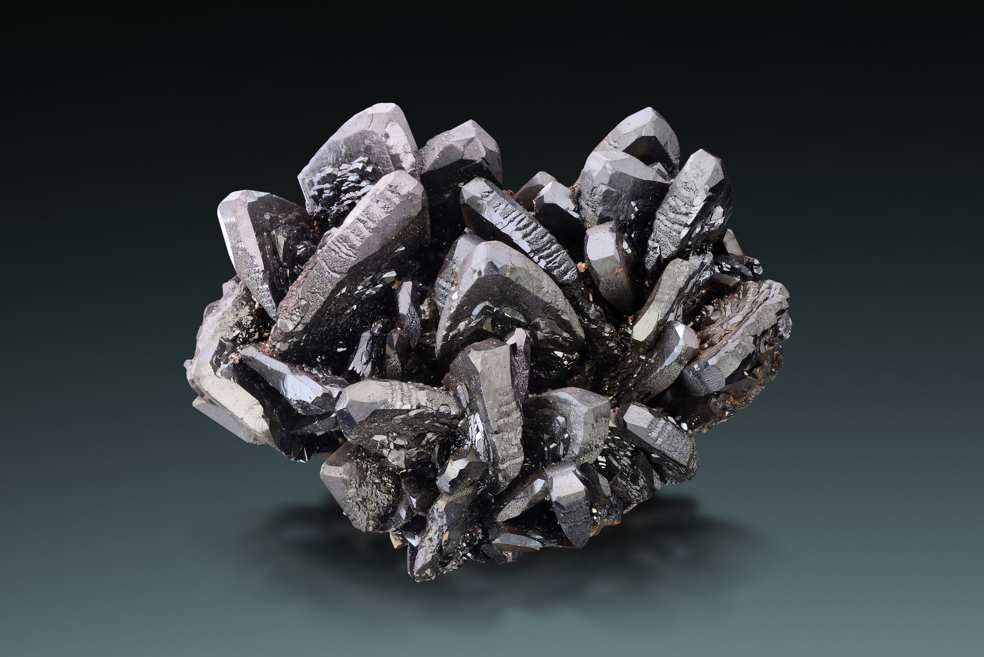 Superb cluster of pagoda style calcite, partly covered by dark iron oxides. Great aesthetics and complete all around! No significant damage to report. Ex Oliver Konczer collection.