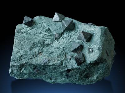 The sharp octahedrons are up to 18 mm across, a remarkable size for the locality and a very eye-catching sample with lots of well exposed crystals.