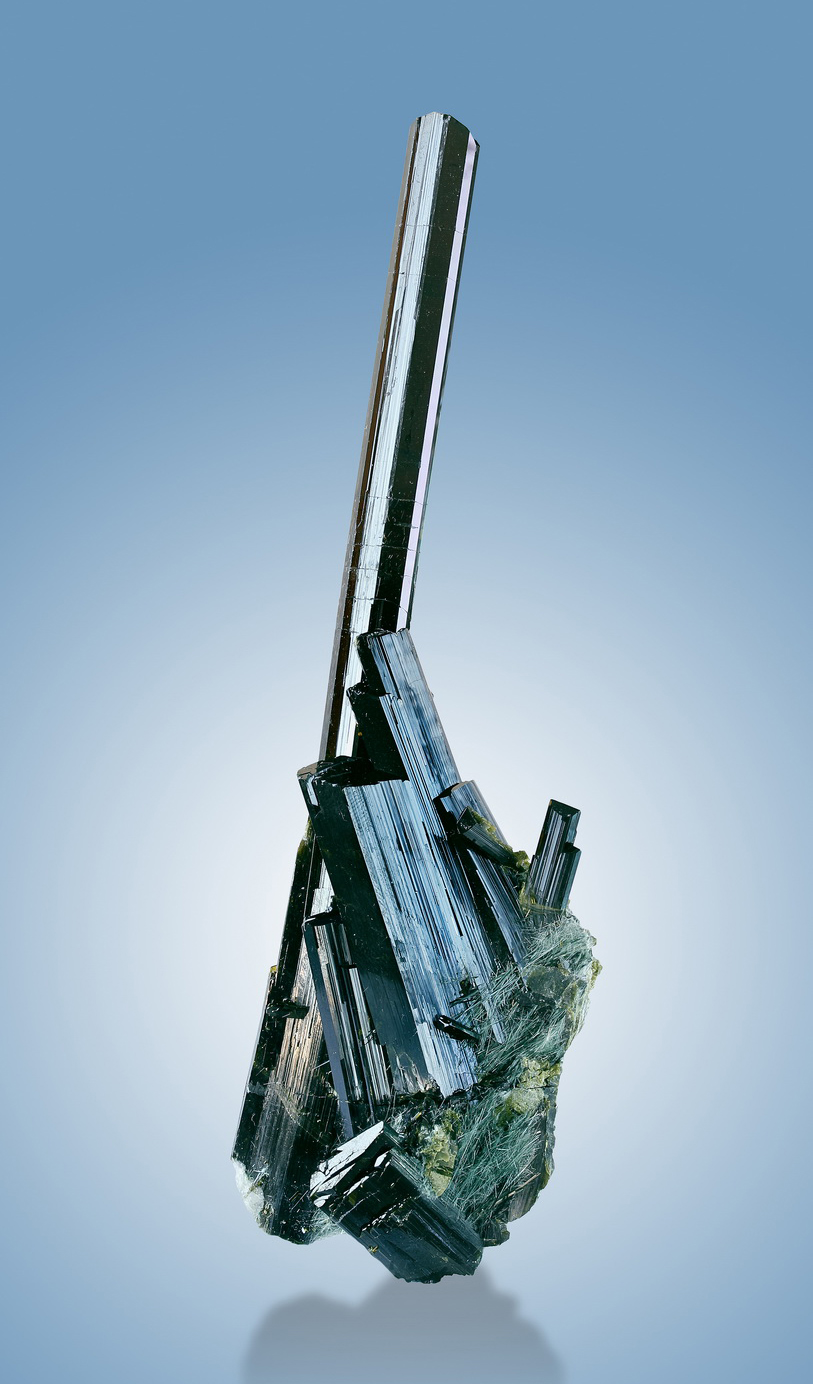 WOW! Whan an awesome epidote rocket, rising up from a cluster group of byssolite and epidote crystals. This is indeed one of the tallest crystals I have ever seen from this famous locality, it measures incredible 17.3 cm from top to bottom! The crystal crossing on the lower right side is thick and sturdy, it measures 2,7 cm in width and features a sharp and brilliant termination. The size is indeed shocking and impressive, and the luster is great all around as well. It is actually bright like a mirror, the best I heve seen from this famous classic locality. This piece comes from one of the last great pockets found in 2008/2009 mining season. The locality has produced nothing even close since then. Unfortunately, the miners are quite sure that the Knappenwand is most likely exploited and production will come to an end soon. This is an excellet opportunity to get one of the best and tallest epidote specimens ever fond at this classic Alpine locality. Repaired 10x, all lock fit, no parts missing though, and no damage on any of the terminations.