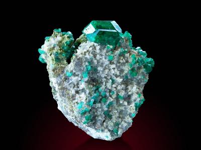 Brilliant and bright green dioptases perched atop a quartz matrix. The crystals are doubly-terminated and measure 12 mm tip to tip. Another lime green species, probably duftite, sets a pleasing contrast which is so typical for the locality. Numerous tiny gemmy dioptases are scattered around the matrix. Striking aesthetics, perfect condition.