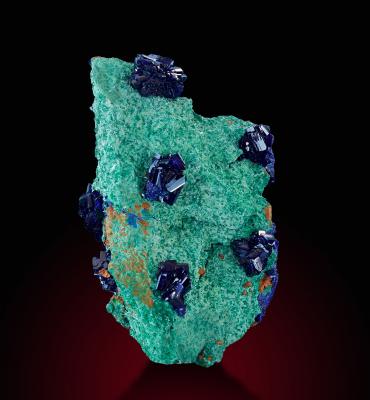 Sphereical aggregates of sparkling, sharp and roayal blue azurite crystals attractively set on intense green malachite. Really a superb contrast and a more uncommon style for this famous classic locality.