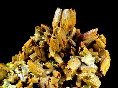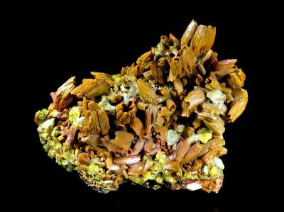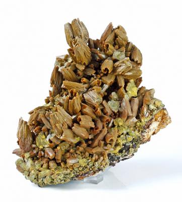 This is a highly aesthetic specimen featuring several freestanding crystal sheaves of pyromorphite. The crystals have a very nice olive green to brownish colour, and the main crystals show somehow hollow crystal formations at their terminations.