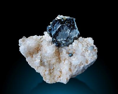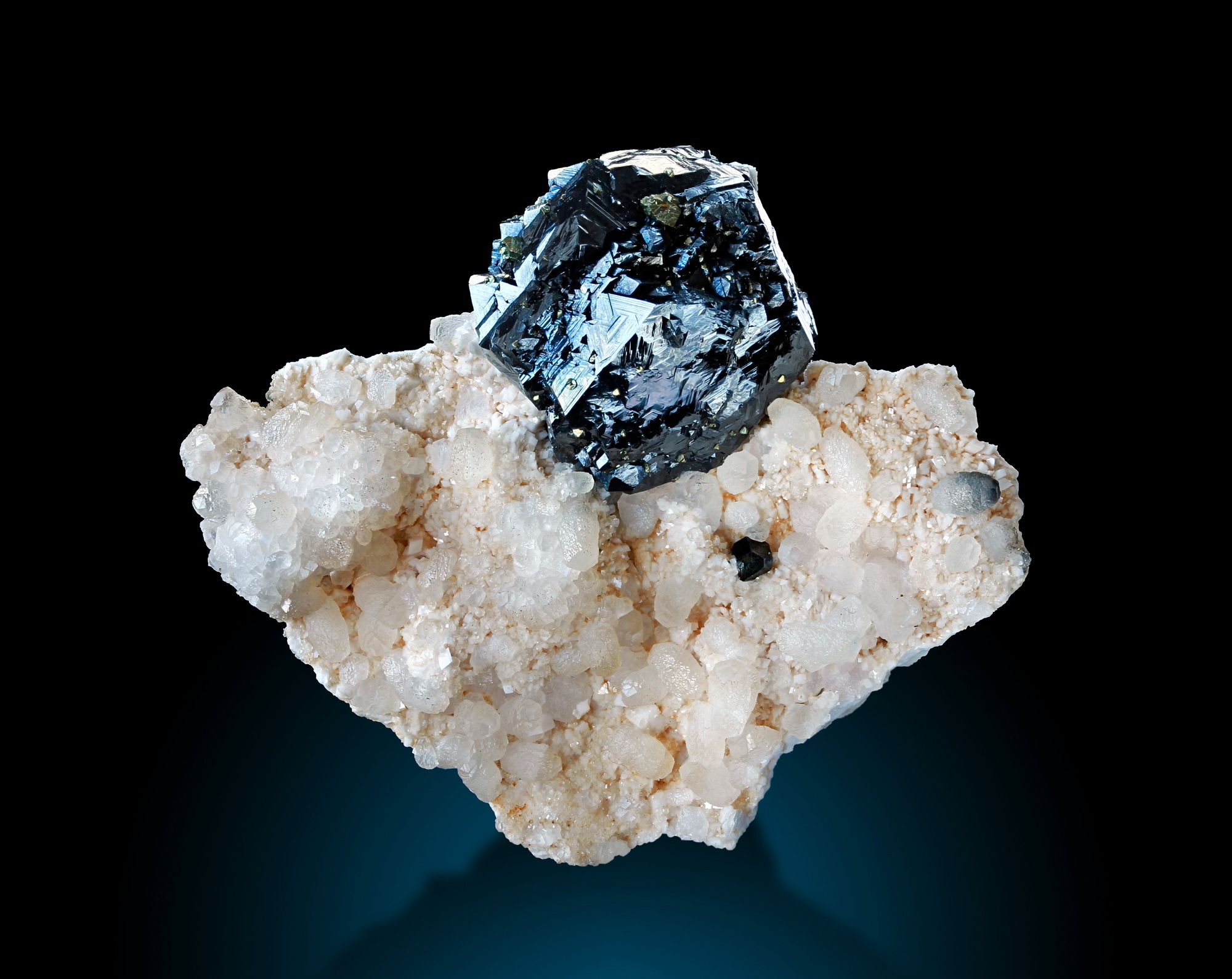 A large and highly brilliant sphalerite crystal is perfectly perched on a piece of dolomite and calcite matrix. Quite a number of tiny chalcopyrite crystals are scattered around on the sphalerite, another pleasing contrast. Great aesthetics, no damage.
