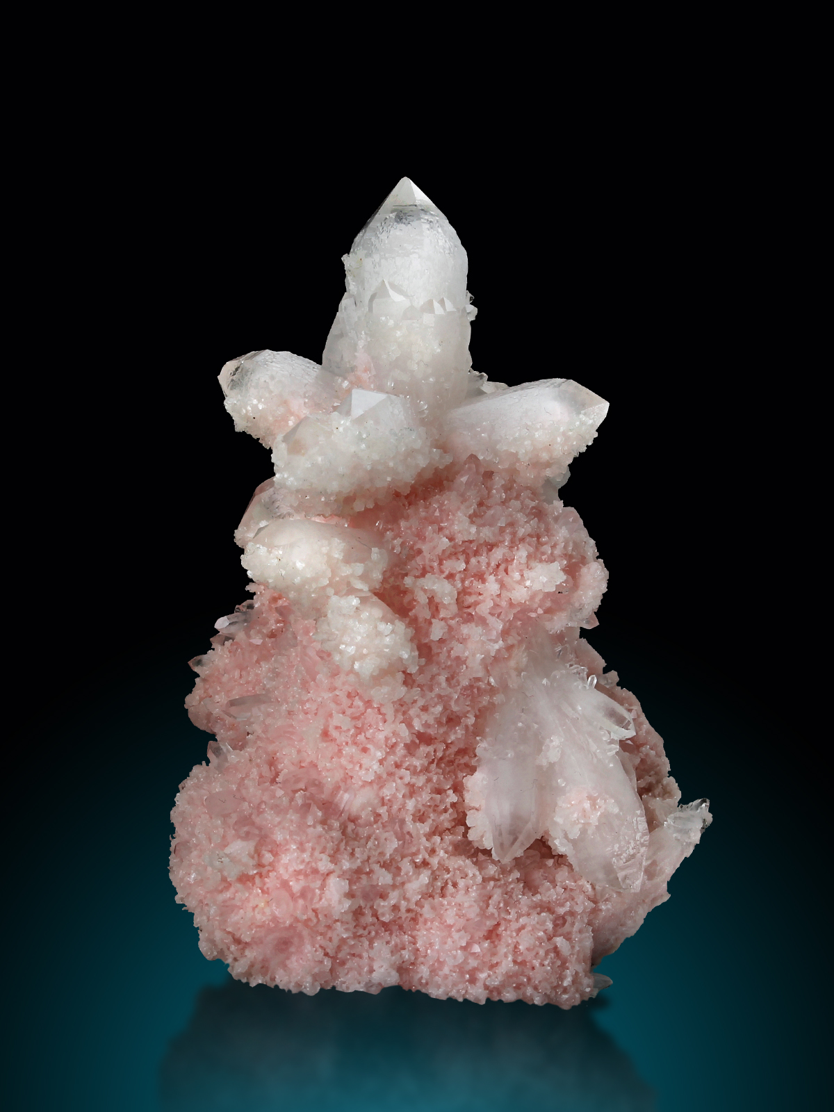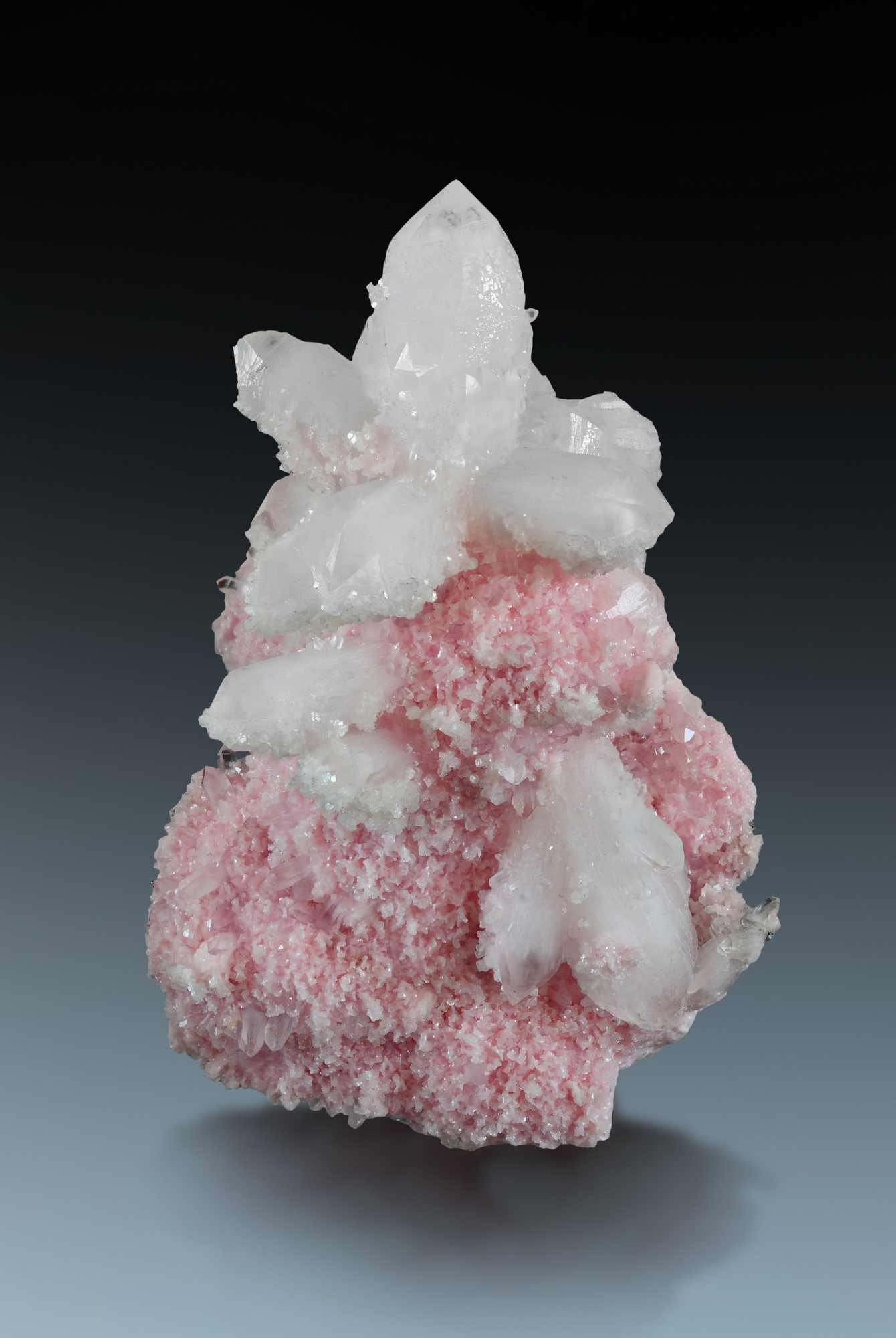 A spray of milky quartz crystals set atop lovely pink rhodochrosite crystals. This is a marvellous specimen of great condition and aesthetics. Ex Leo Thalhammer collection.