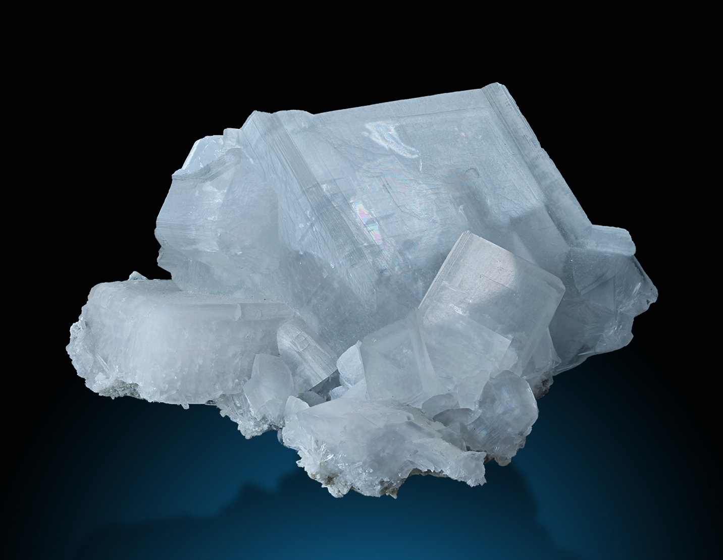 Clear smoky quartz cluster with minor hematite flakes resting on some of the crystal faces. Excellent clarity, no damage.