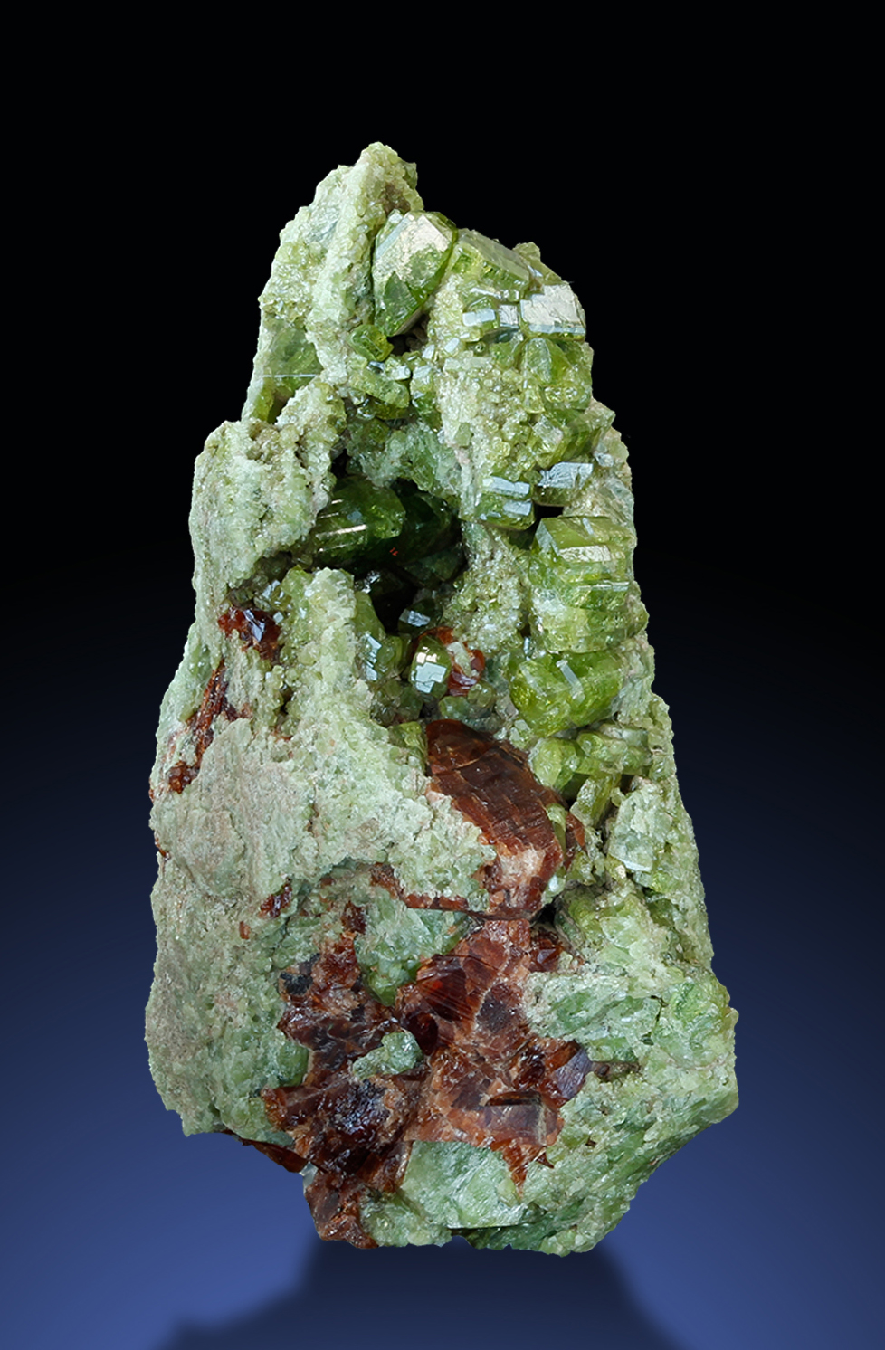 The combination of both minerals is very rare from this rodingite locality. The vesuvianite developed small crystals up to 10 mm long, and the hessonite shows sharp, glossy faces and nicely contrasting red color.
