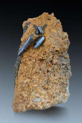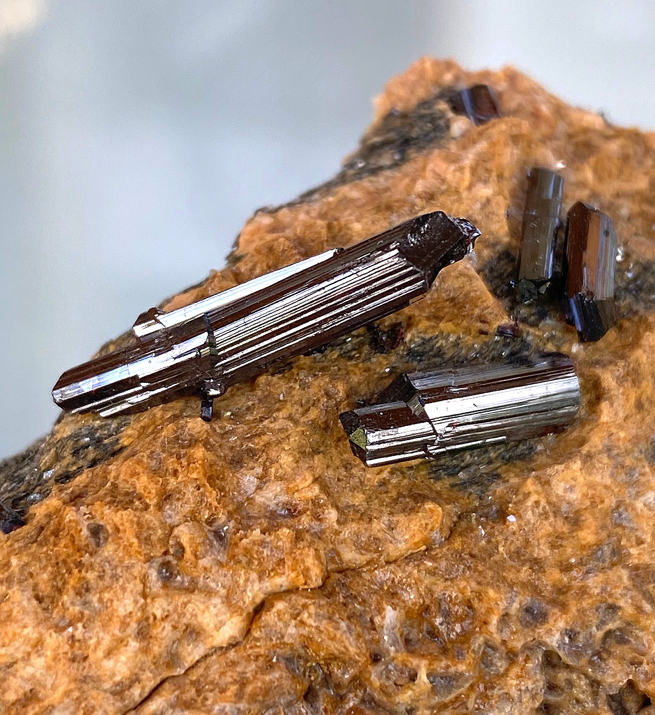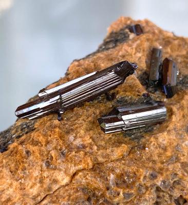 Four doubly-terminated rutile crystals up to 20 mm in length resting on a calcite and schist matrix. One of them even shows the typical knee twinning. The crystals are in perfect conditon and the luster is the best you can look for.