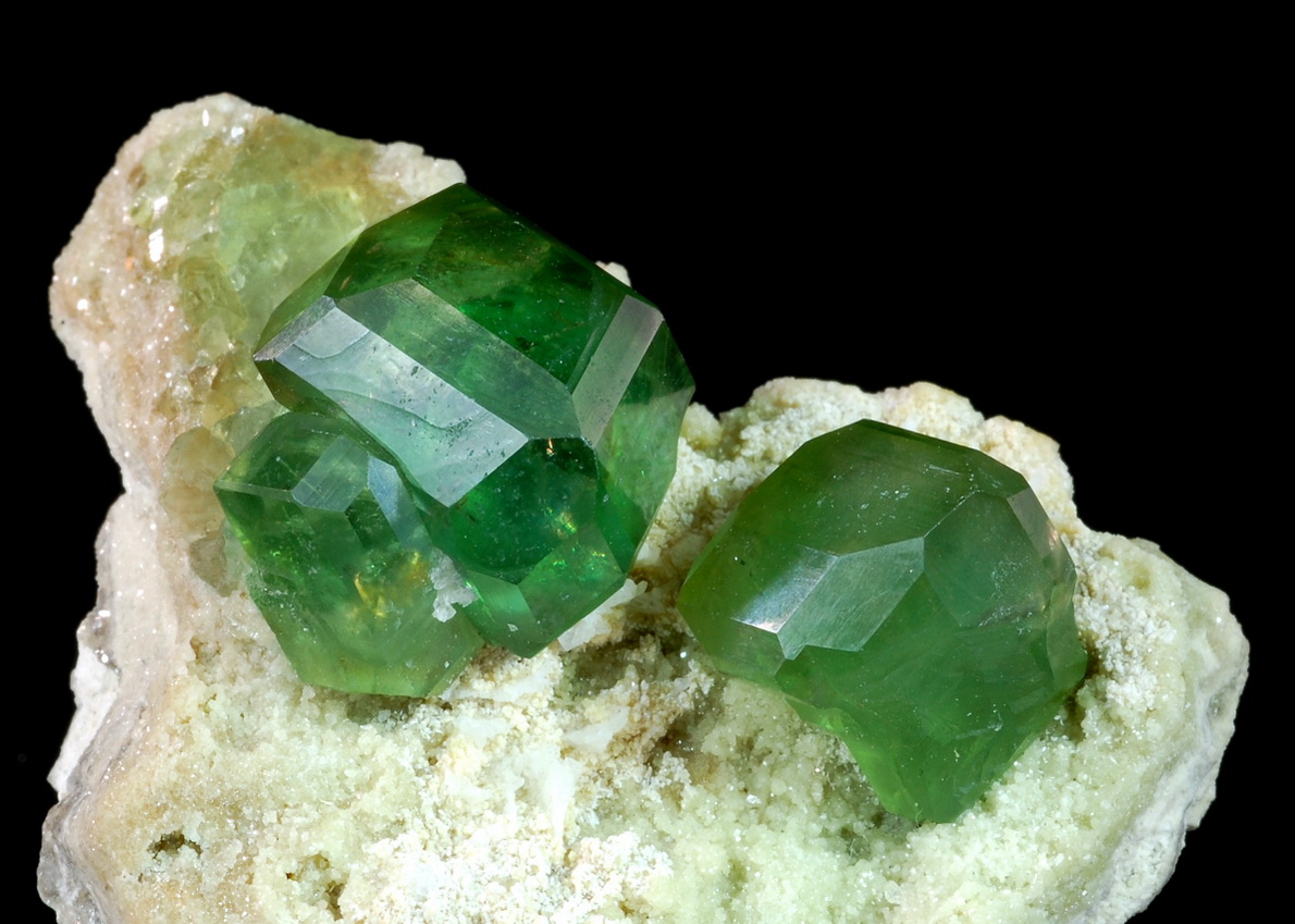Illustrated in the Mineralogical Record, May-June 2010, page 220. This is a gorgeous killer miniature of exceptionally fine quality! A piece of marble matrix hosts two pristine and sharply edged demantoid crystals. Especially the larger crystal, measuring 14 mm across, has truly superb clarity, luster and colour! One of the very best miniature specimens ever found at the locale!