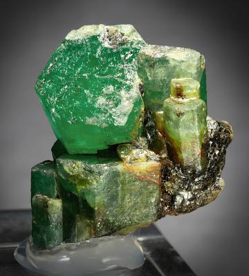 Well formed emerald crystals up to 20 mm in diameter on biotite schist matrix. Especially the main crystal shows a very deep green colour.