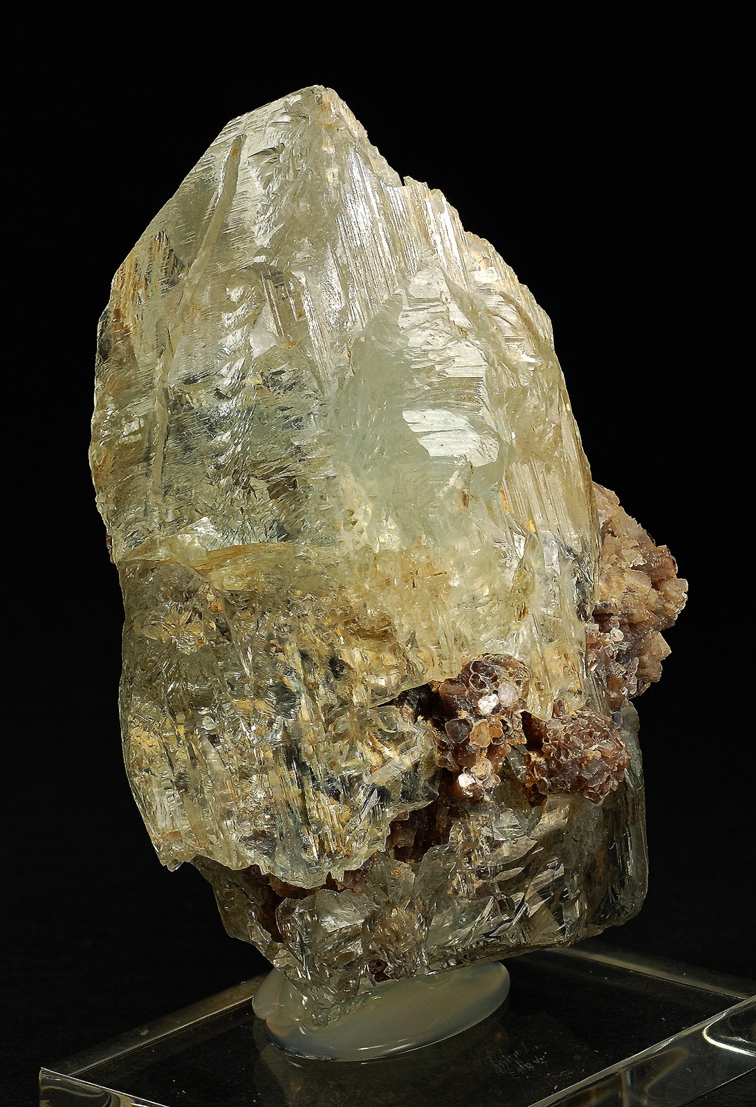 A feldspar crystal is host to a clear and freestanding aquamarine. Two smaller aquamarine crystals, white albites and nice mica blades are in association right next to the main aquamarine and accent its predominant position. The upper termination faces show nicely bevelled edges. No damage.