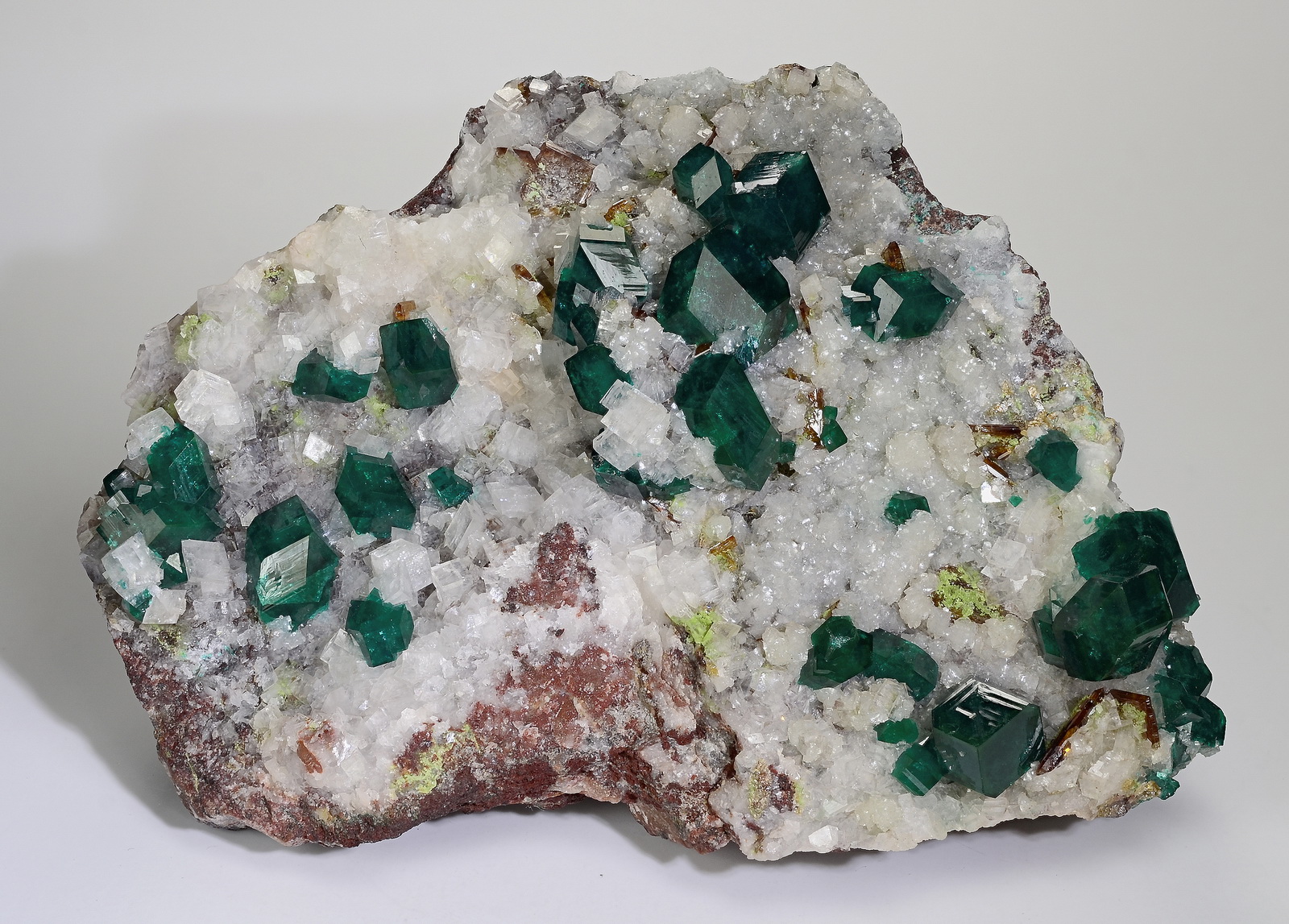 Dioptase, duftite and red wulfenites on white calcite matrix. Classic combination from tsumeb!